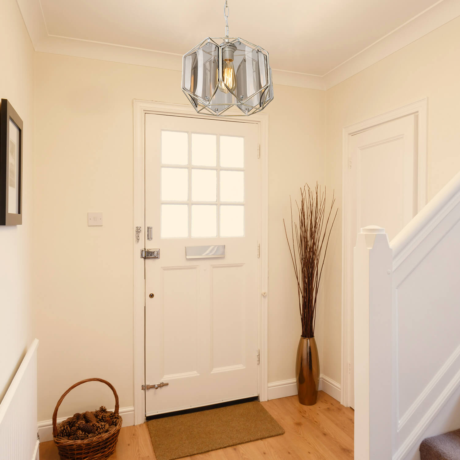 • Grâce au verre fumé spécialement conçu du cadre en profilé de tige métallique de conception géométrique, il fournit une diffusion homogène de la lumière dans l'environnement.