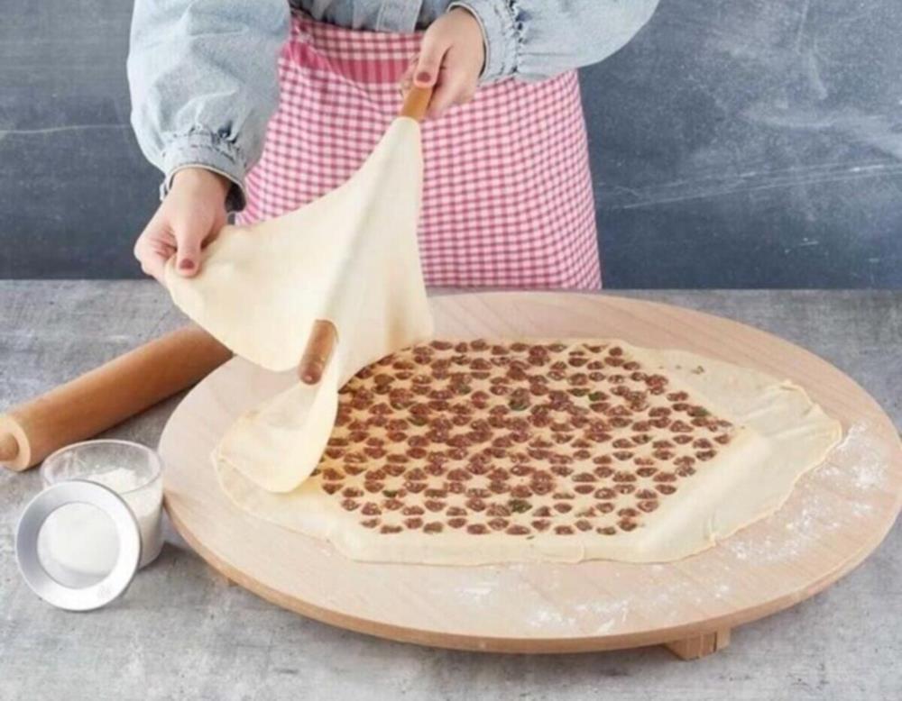 Utilisation : La pâte qui a été étalée est déposée sur le moule à raviolis. La quantité désirée de mortier de pâte est déposée sur les interstices formés dans la pâte, la deuxième pâte qui a été ouverte est déposée sur le moule et elle est passée fortement au rouleau.