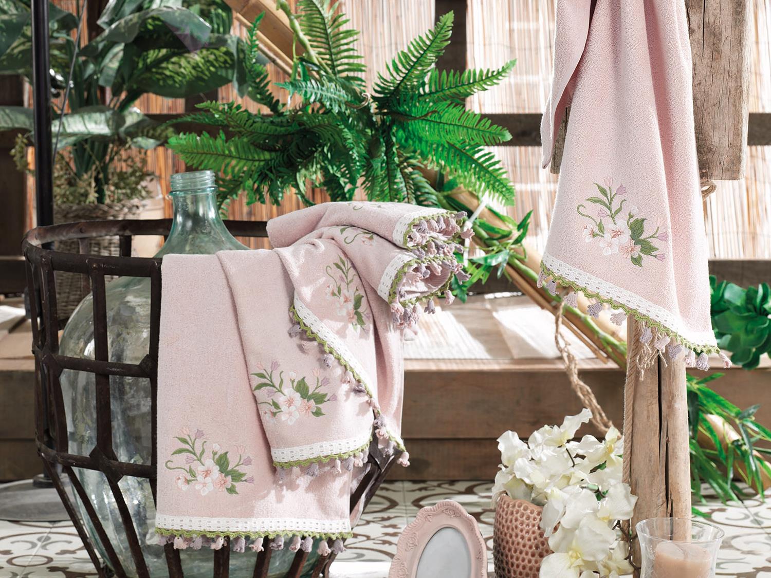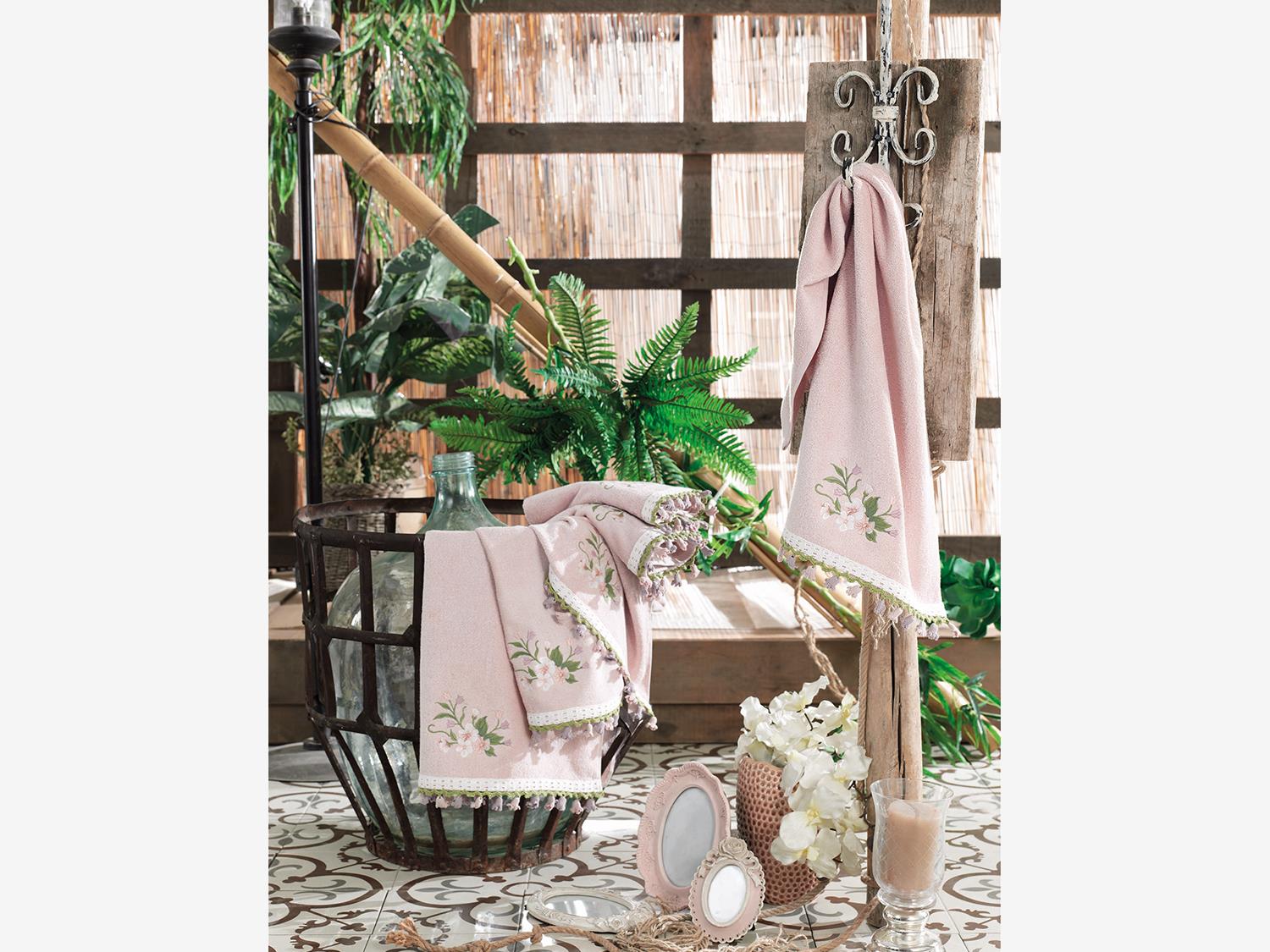 Nakışlı Manolya El İşi Çeyizlik Bambu Havlu Pudra | Dantela