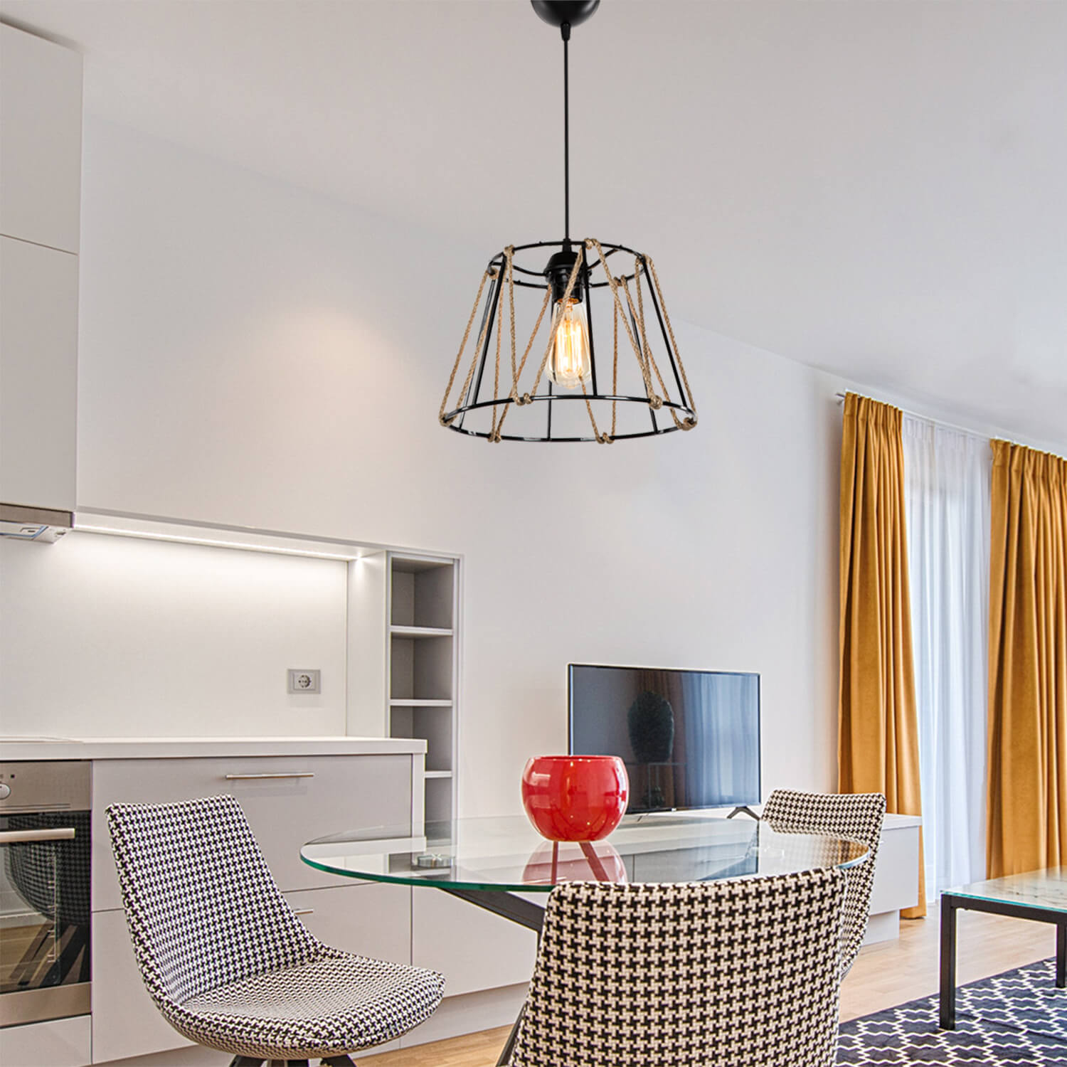Hauteur du plafond: 60 cm Longueur du boîtier: 23 cm Diamètre du boîtier: 30 cm. . Reflétant l'atmosphère authentique et nostalgique ensemble et ayant un design élégant, "Balat Black Pendant" attire l'attention de ceux qui veulent faire une différence dans la décoration. . Les cordes authentiques entourant la cage en mélange ABS et POLICARBONATE ajoutent une ambiance différente à l'environnement. . Grâce aux serre-câbles DMK utilisés dans l'installation, l'installation électrique a été renforcée. . Les rozans sphériques utilisés dans l'installation ajoutent également une apparence esthétique à la conception du produit. . L'équipement utilisé est un matériau (100% cuivre conducteur) conforme aux normes TSE. . Le nettoyage du produit peut être effectué facilement avec un chiffon humide.