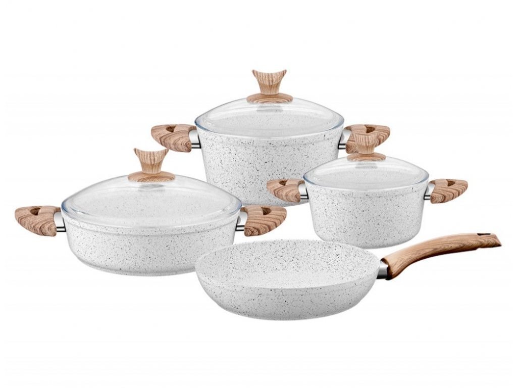 L'ensemble de casseroles Granit Plus, qui facilite la cuisson et le service des plats grâce à sa surface ignifuge et antiadhésive, se compose de 7 pièces. La batterie de cuisine en granit, qui offre une utilisation facile avec ses poignées en bois, réunit toute la noblesse du blanc avec votre cuisine.