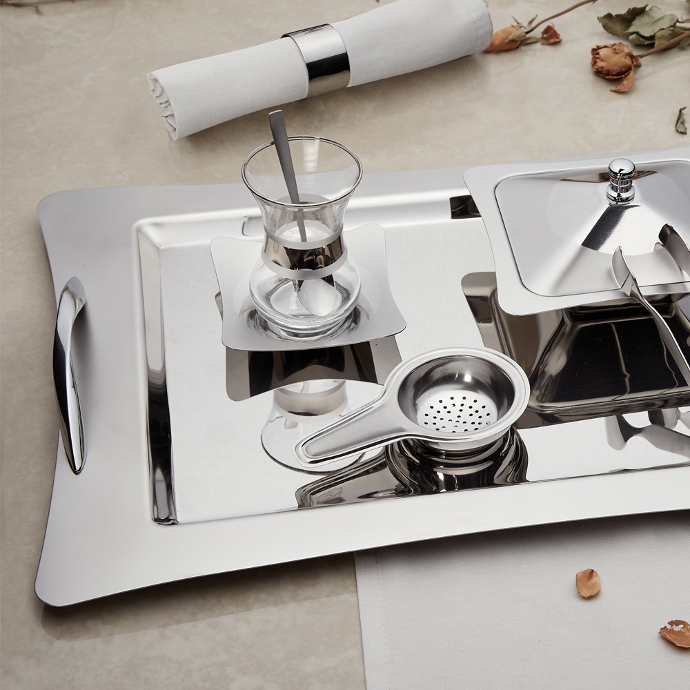 Vous pouvez utiliser l'élégant service à thé en satin Karanfil pour vos conversations quotidiennes sur le thé et pour vos tables d'invitation. La surface satinée mate de son plateau et son acier brillant effet miroir sont idéales pour vos présentations inspirantes. Toutes les pièces du service à thé en satin de girofle peuvent être lavées au lave-vaisselle.