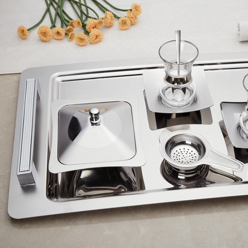 Vous pouvez utiliser l'élégant service à thé en satin Sena à la fois dans vos conversations quotidiennes sur le thé et à vos tables d'invitation. La surface satinée mate de son plateau et son acier brillant effet miroir sont idéales pour vos présentations inspirantes. Nous vous recommandons de laver à la main notre service à thé Sena pour une durée de vie plus longue.
