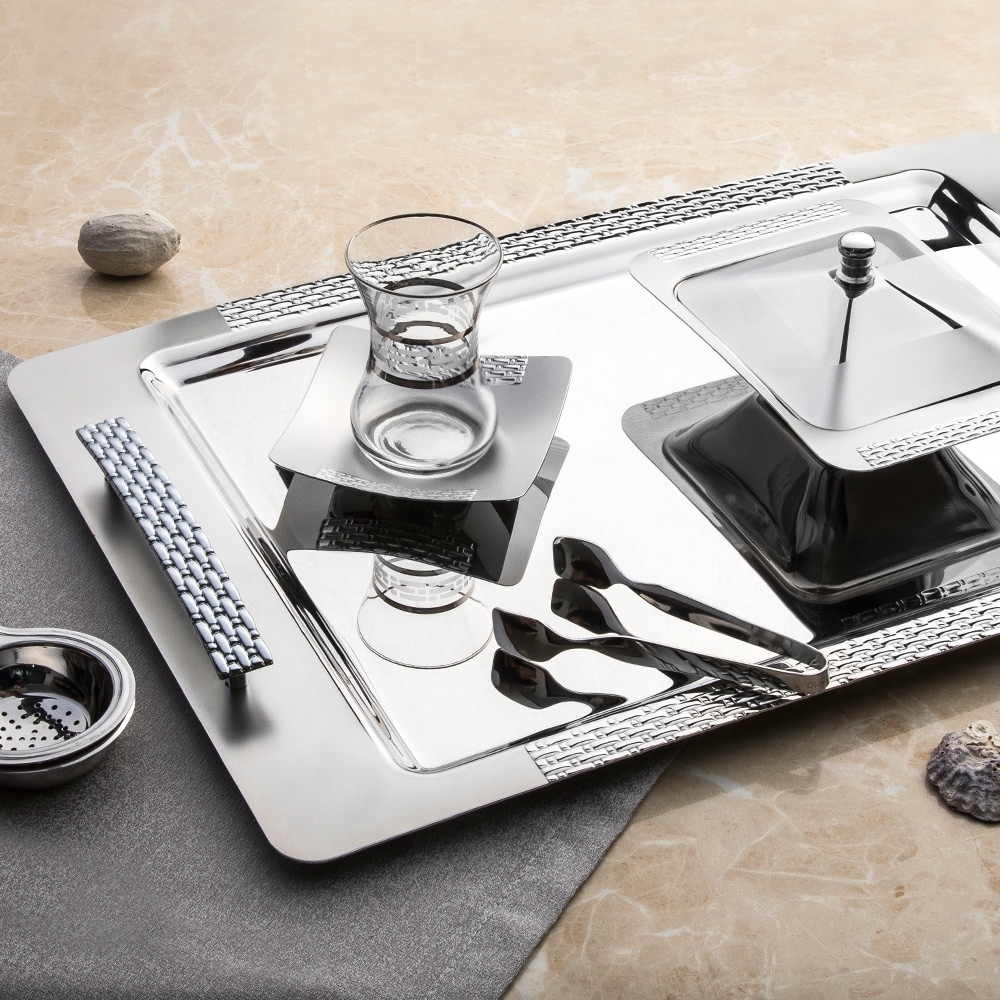 Vous pouvez utiliser l'élégant service à thé Sırma pour vos conversations quotidiennes sur le thé et pour vos tables d'invitation. La surface satinée mate du plateau ondulé et son miroir en acier brillant sont idéales pour vos présentations inspirantes. Toutes les pièces du service à thé Sırma peuvent être lavées au lave-vaisselle.