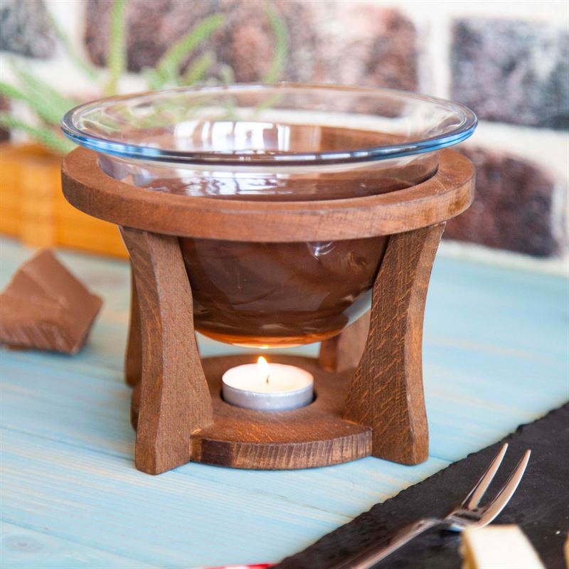 Le produit comprend 1 récipient à fondue en verre, 2 fourchettes à fondue et 1 support en bois pour une bougie chauffe-plat.