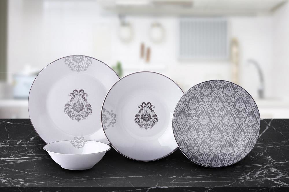 Teslimat ve Boyutlar: Taç Raks 24 Parça Gri Osmanlı Tuğralı Porselen Yemek Takımı | 6 Kişilik I TAC-204 I