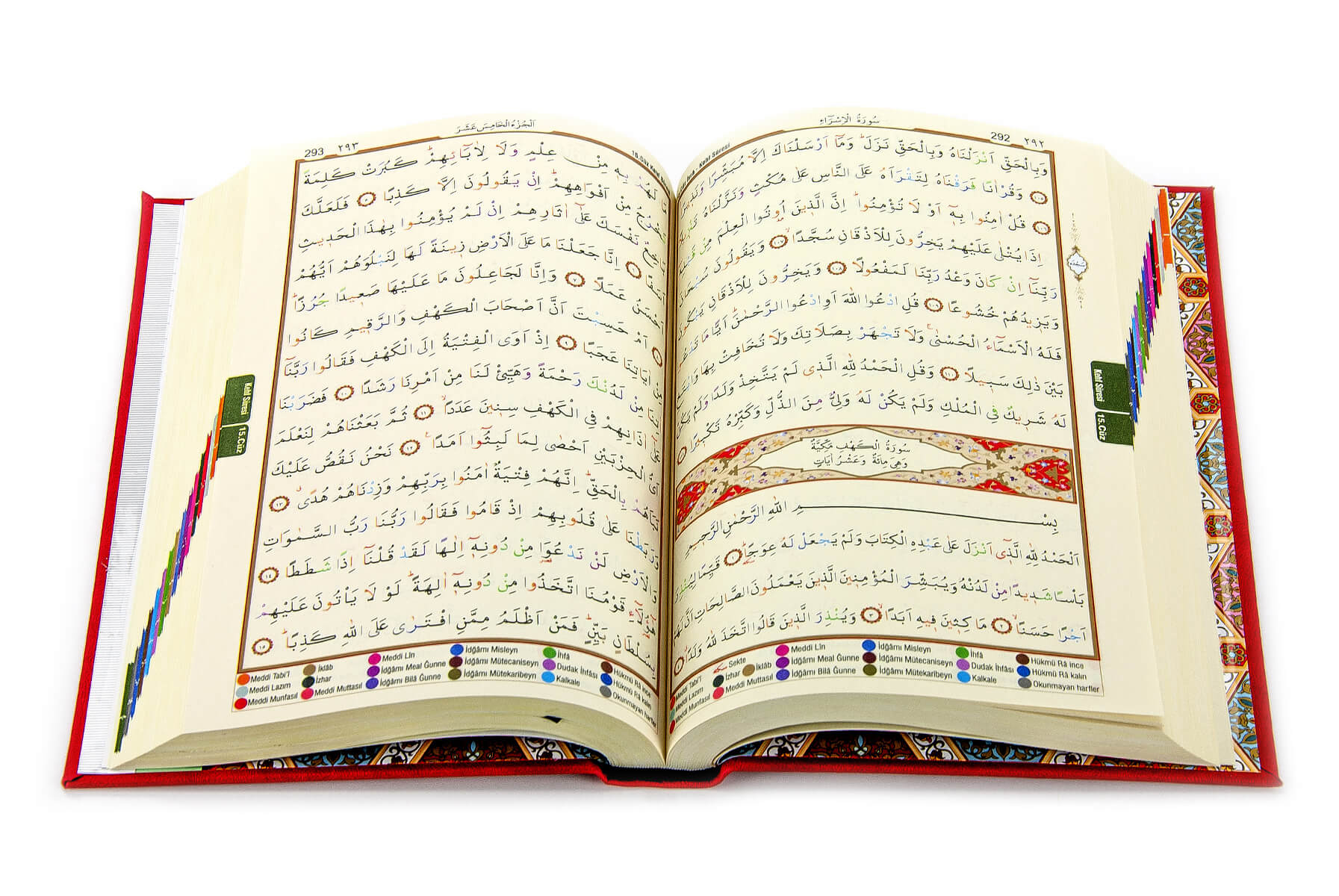 "Lisez le Coran clairement, avec grain et grain" (Muzzemmil Sura; 4) "Tertir, qui signifie harmonie et ordre. Ici, il est expliqué comme" donner le droit de chaque lettre et la lire sans hâte "Ali (Radiallahu Anh ) Dans les mots de notre maître, "La disposition des lettres est de donner le droit de chaque lettre et de connaître les arrêts." C'est un travail qui nécessite une formation à long terme d'une personne compétente pour mémoriser toutes les règles de tajwid et appliquez-le si nécessaire. C'est un fait que tout le monde n'a pas ces possibilités. Cela a toujours été une question qui fait que les enseignants du cours du Coran pensent que le Coran est une solution depuis de nombreuses années. équipe qui connaît les sciences de l'An-ı Kerime et du Coran. C'est le premier du Coran en Turquie. fois faites par nous. Nos précieux professeurs dans mon équipe; Hafız İsmail YÜCEL Hafız Ömer AK YILDIZ. Je tiens à exprimer ma gratitude à Hafız Kemal AKIRMAK, Hafız Cihat YILMAZ et mon frère Nurullah KAHRAMAN, qui n’ont pas épargné son soutien tout au long de sa période de travail. fonctionnalités. Toutes les bases de tajwid sont traitées en catégories et chaque catégorie est colorée avec une couleur différente. La signification de chaque couleur est indiquée par leurs noms courts en bas de page. Les tapis de prière sont laissés en rouge. Dans des endroits comme (Müsemmen Maen), il est marqué comme "med" au lieu de "meddi" parce que ce n'est pas naturellement apparent. Les règles de Tajwid ont été appliquées en considérant l'état de transition.