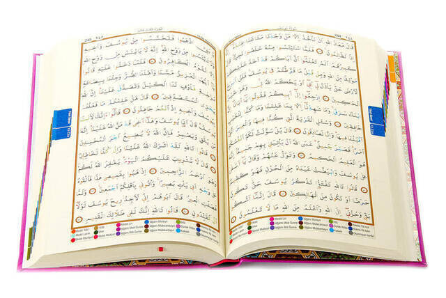 "Lisez le Coran clairement, avec grain et grain" (Muzzemmil Sura; 4) "Tertir, qui signifie harmonie et ordre. Ici, il est expliqué comme" donner le droit de chaque lettre et la lire sans hâte "Ali (Radiallahu Anh ) Dans les mots de notre maître, "La disposition des lettres est de donner le droit de chaque lettre et de connaître les arrêts." C'est un travail qui nécessite une formation à long terme d'une personne compétente pour mémoriser toutes les règles de tajwid et appliquez-le si nécessaire. C'est un fait que tout le monde n'a pas ces possibilités. Cela a toujours été une question qui fait que les enseignants du cours du Coran pensent que le Coran est une solution depuis de nombreuses années. équipe qui connaît les sciences de l'An-ı Kerime et du Coran. C'est le premier du Coran en Turquie. fois faites par nous. Nos précieux professeurs dans mon équipe; Hafız İsmail YÜCEL Hafız Ömer AK YILDIZ. Je tiens à exprimer ma gratitude à Hafız Kemal AKIRMAK, Hafız Cihat YILMAZ et mon frère Nurullah KAHRAMAN, qui n’ont pas épargné son soutien tout au long de sa période de travail. fonctionnalités. Toutes les bases de tajwid sont traitées en catégories et chaque catégorie est colorée avec une couleur différente. La signification de chaque couleur est indiquée par leurs noms courts en bas de page. Les tapis de prière sont laissés en rouge. Dans des endroits comme (Müsemmen Maen), il est marqué comme "med" au lieu de "meddi" parce que ce n'est pas naturellement apparent. Les règles de Tajwid ont été appliquées en considérant l'état de transition.
