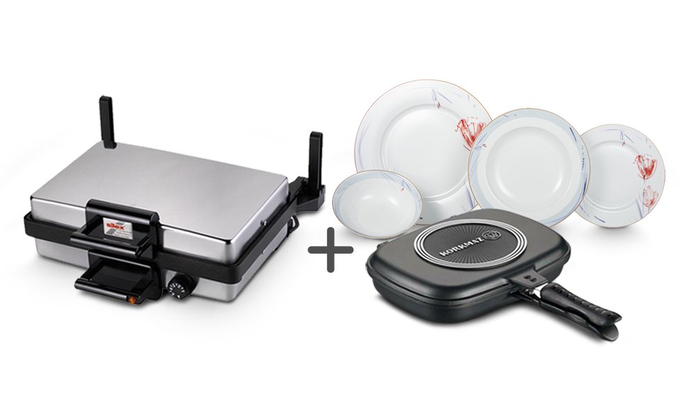 Teslimat: 1x Silex Gümüş Izgara Makinesi & Korkmaz Siesta Collection 48 Parça Yemek Takımı & Korkmaz Duplo Balık Tavası