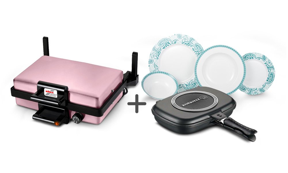 Teslimat: 1x Silex Pembe Izgara Makinesi & Korkmaz Siesta Collection 48 Parça Yemek Takımı & Korkmaz Duplo Balık Tavası