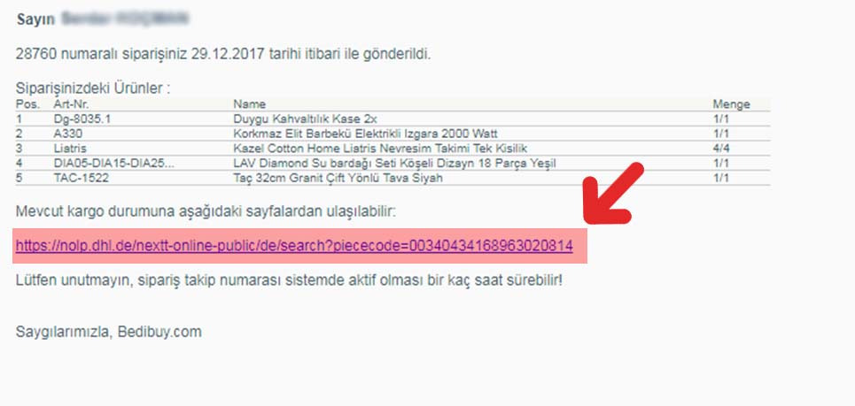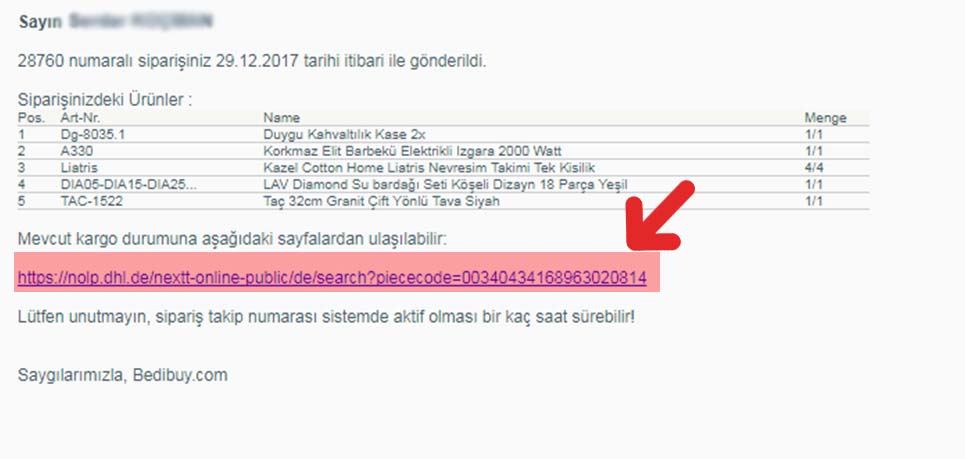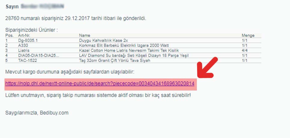 Maildeki internet sayfasına girerek Paketiniz ne zaman yola çıktığını, ne zaman size ulaşacağını ve eğer kargoda sorun olursa sorunun ne olduğunu ve ne yapmanız gerektiğini görebilirisiniz.