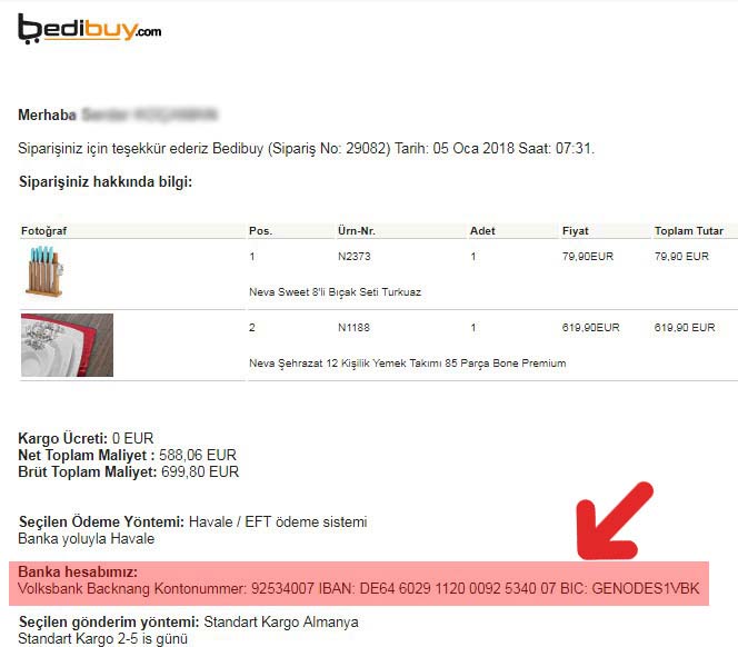 Lütfen toplam miktarı Bankanıza giderek veya Bankanızın Telefon uygulaması üzerinden şirketimiz hesabına gönderiniz. Bu işlem 2-5 Gün arası sürebilir. Toplam Miktar Hesabımıza giriş yaptıktan en fazla 24 saat sonra Paketiniz Kargo Şirketine teslim edilecektir ve ayni esnada size tekrar bir Kargo Bilgilendirme Maili gönderiliyor.