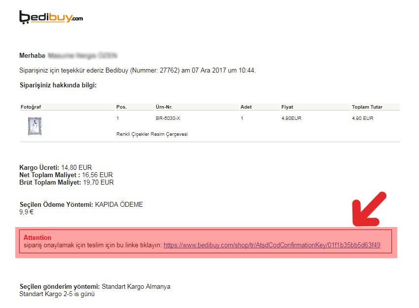 Kapıda Ödeme seçtiğiniz zaman Mail adresinize Sipariş Onay Maili gönderiyoruz. Bu mail de Toplam Tutar, sipariş detaylarınız ve bu ürünlerin siparişinin tamamlanabilmesi için Sipariş Onay Linki mevcuttur. Bu onay siz değerli müşterimiz tarafından mutlaka yapılmalıdır Aksi takdirde siparişiniz tamamlanmayacaktır.