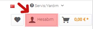 Öncelikle sitemizden kullanıcı girişi yapmalısınız. Bunun için sayfanın sağ üst bölümünde bulunan "Hesabım" düğmesine tıklayın.