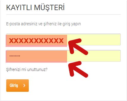 Müşteri girişi yapabilmeniz için giriş sayfası ile karşılaşacaksınız. Bu sayfaya "E-Posta Adresinizi" ve "Şifrenizi" girerek "Giriş" düğmesine tıklayın.