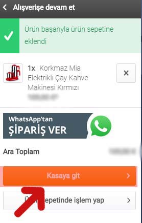 Satın almak istediğiniz ürünleri sepetine ekleme işlemini tamamladıktan sonra "Kasaya Git" düğmesine tıklayarak ödeme sayfasına geçebilirsiniz.
