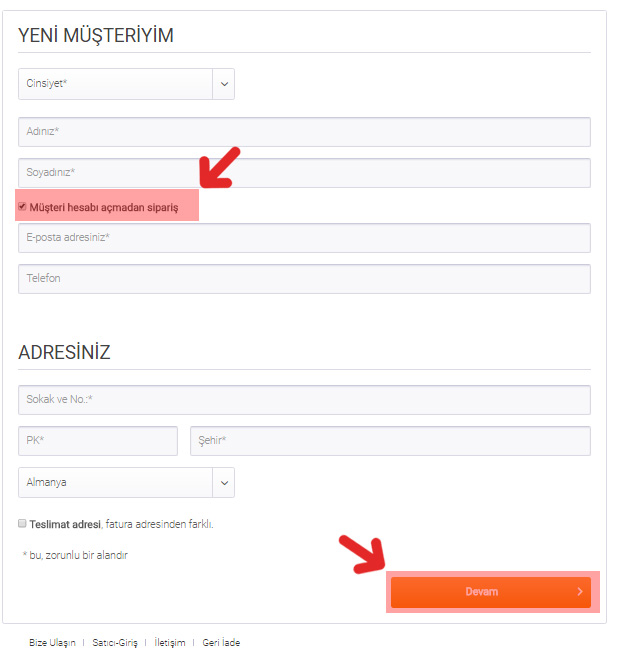 “Müşteri hesabı açmadan sipariş” seçeneğini işaretleyip müşteri kaydı oluşturmadan da siparişlerinizi tamamlayabilirsiniz.