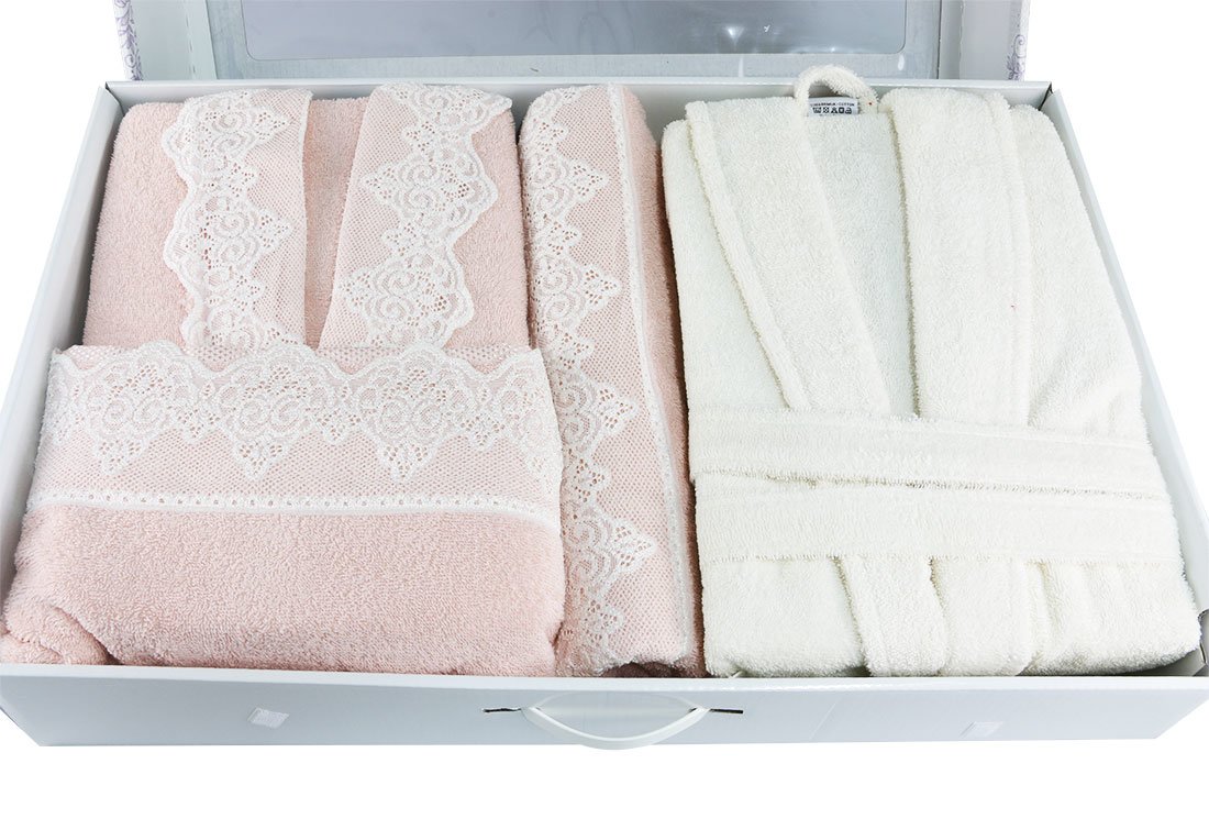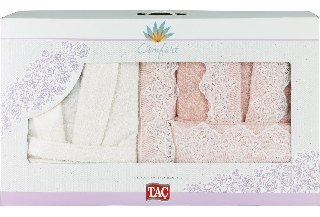 Teslimat ve Boyutlar: 1 x Taç Comfort Dantelli Aile Bornoz Seti | Pudra&Ekru | 11181