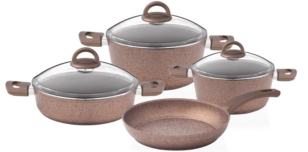 Teslimat ve Boyutlar: 1 x Taç Family Cook 4'lü Granit Tencere - Tava Seti 7 Parça | Kahverengi | TAC-3119