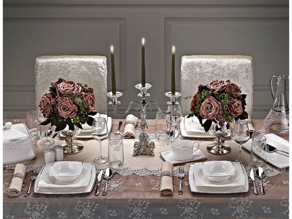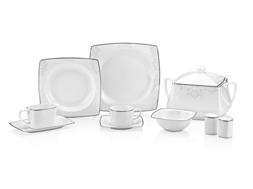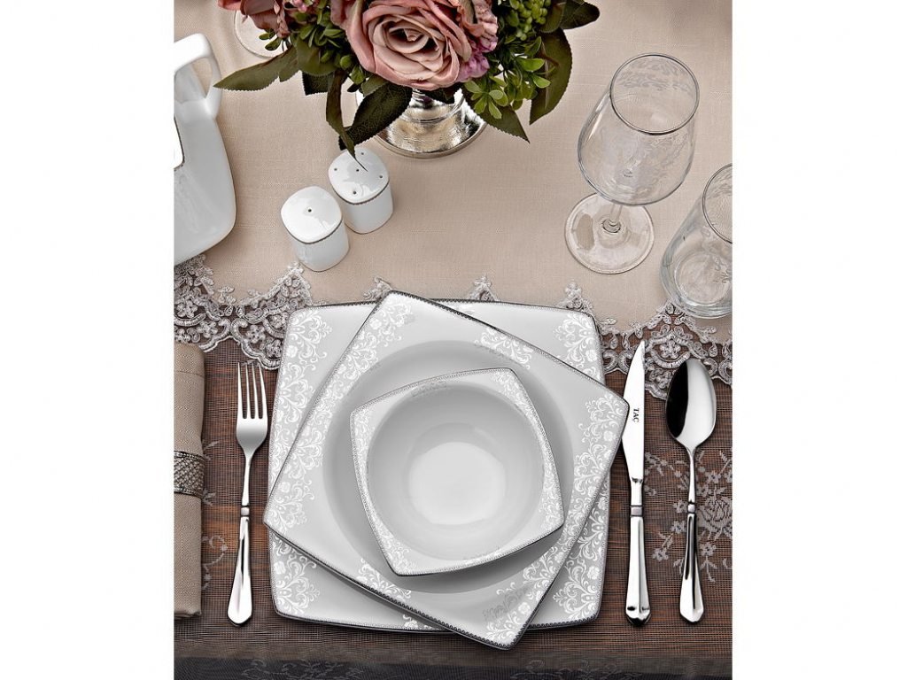 Teslimat ve Boyutlar: 1 x Taç Mühr-ü Sedef Mahfuz 85 Parça Yemek Takımı | Kare | 12 Kişilik | TAC-2057