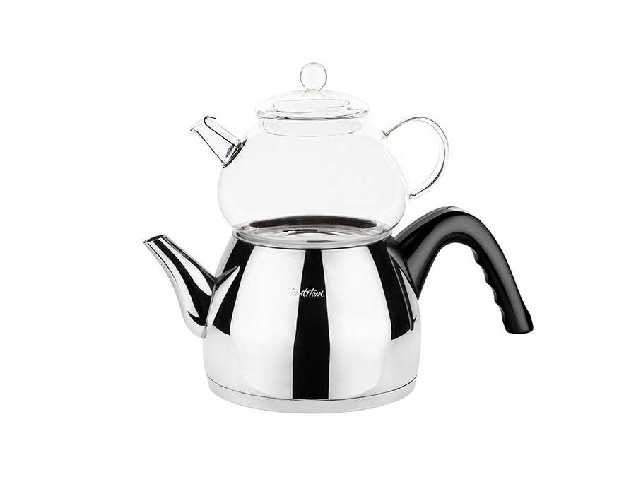 slanmaz çelik ara kapağa sahiptir.*Özel alışımı sayesinde içinde ve dışında bakteri oluşturmaz.*İndiksiyon ocaklara uyumlu kapsül tabanlıdır.*Isı tutan tabanı yakıttan ve zamandan tasarruf sağlar.*Estetik ve temiz görünümü ile her türlü servis masasında güvenle kullanılabilir.*Çaydanlık takımının demliği borosilikat cam malzemeden üretilmiştir, çaydanlığı ise 304 kalite paslanmaz çelikten üretilmiştir ve 0.90 mm kalınlığındadır.*Çaydanlık takımının borosilikat olan demliğinin özellikleri: -Kapasitesi 980ml. -Elde yıkanması tavsiye edilir. -Isı değişimine maruz bırakılmamalıdır. -Yüksek sıcaklıklarda olmamak şartıyla indüksiyon tabanlı ocaklarda kullanılabilir.*Çaydanlığınızın taban çapından geniş ve harlı ateşte kullanmayınız.*Parlak olan dış yüzeylerinin çizilmemesi için, mutlaka sıvı deterjan,sünger ve yumuşak bir bez kullanınız.*Çaydanlık ve demliğinizin kireçlenmemesi için, kalan çay ve su tortusunu boşaltınız.*Çaydanlığınızı kesinlikle ateşte susuz bırakmayınız.