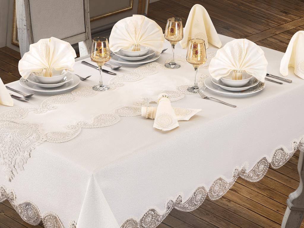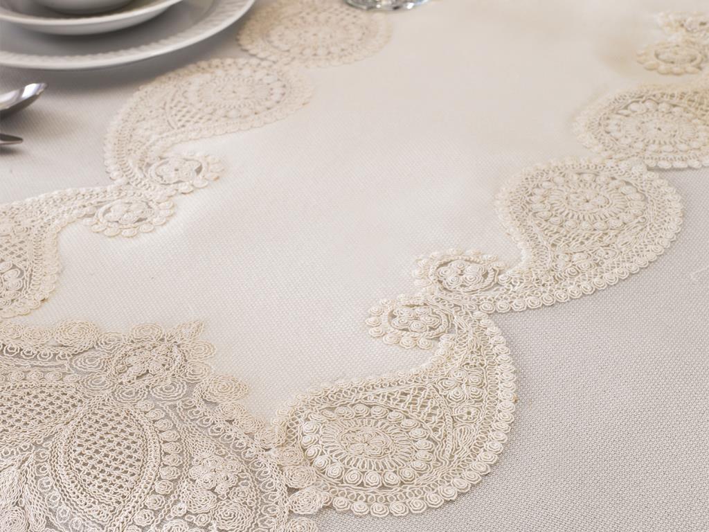 Leke Tutmaz Etuval Linen Kumaştan Kumaştan Üretilmiştir. Masa Örtüsünün Dört Çevresi ve Runner uçları Fransız Taşlı Güpürleri ile süslenerek özel bir tasarım oluşturulmuştur.