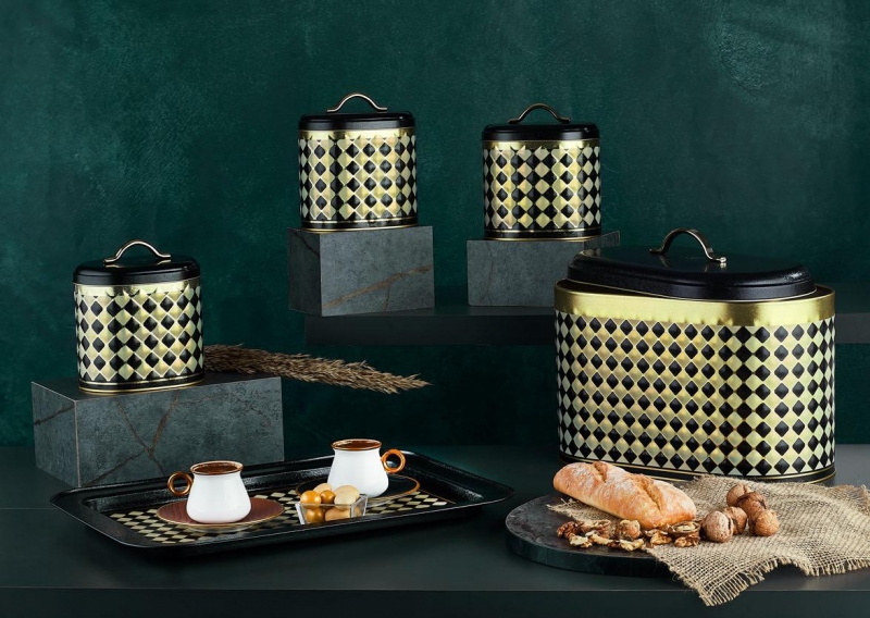 Teslimat: 1 x Vip Ahmet | Dama Desen Kulplu Metal Ekmeklik Baharatlık 4 Parça