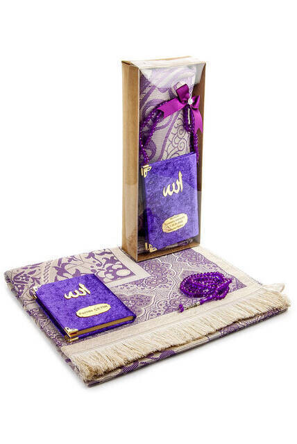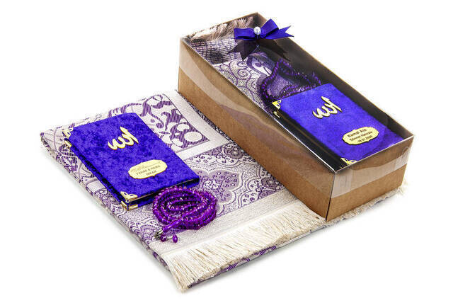 Kadife Kaplı Yasin Kitabı - Cep Boy - İsme Özel Plakalı - Seccadeli - Tesbihli - Kutulu - Mor Renk -